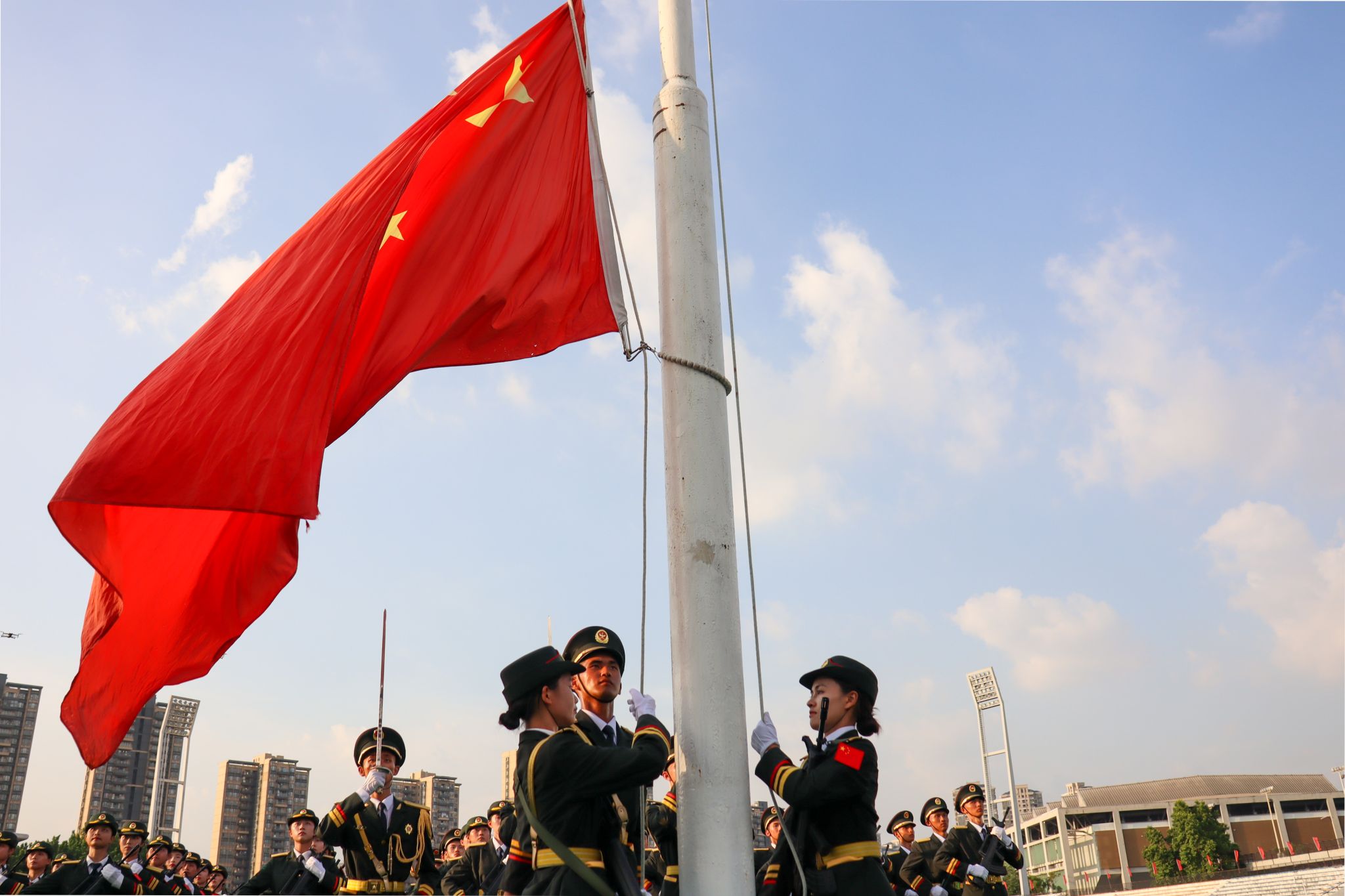军训总结表彰大会拉开帷幕,国旗护卫队队员肩扛五星红旗,踏着整齐的步伐走向升旗台。全体肃立,昂首挺胸,国歌回荡在耳边,全体人员注视着红旗高高升起。