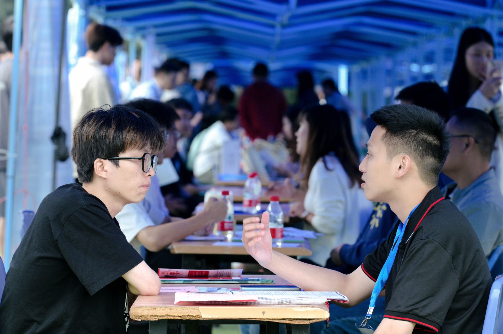 上午10:30,招聘会迎来人流量高峰期,不少用人单位的展位前排起了长龙。蓝色帐篷下,学生与企业招聘人员围绕岗位需求、薪资等问题进行一对一交流。