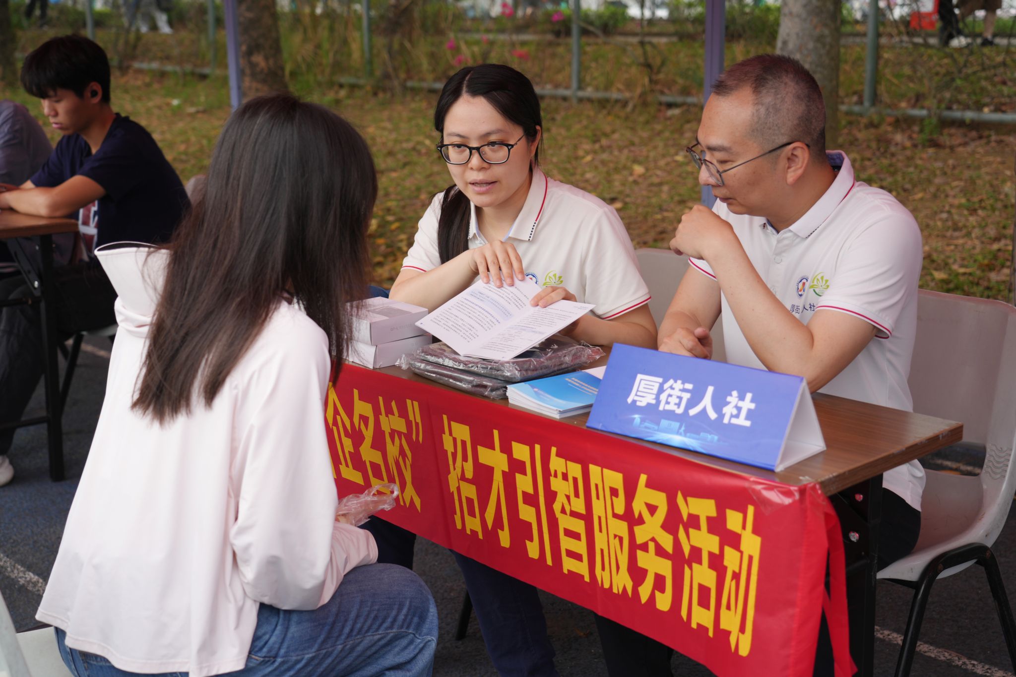 上午9:30,松山湖校区假草田径场热闹非凡。各招聘单位准备就绪,求职者们满怀期待、信心满满,手持简历,寻找心仪的岗位。