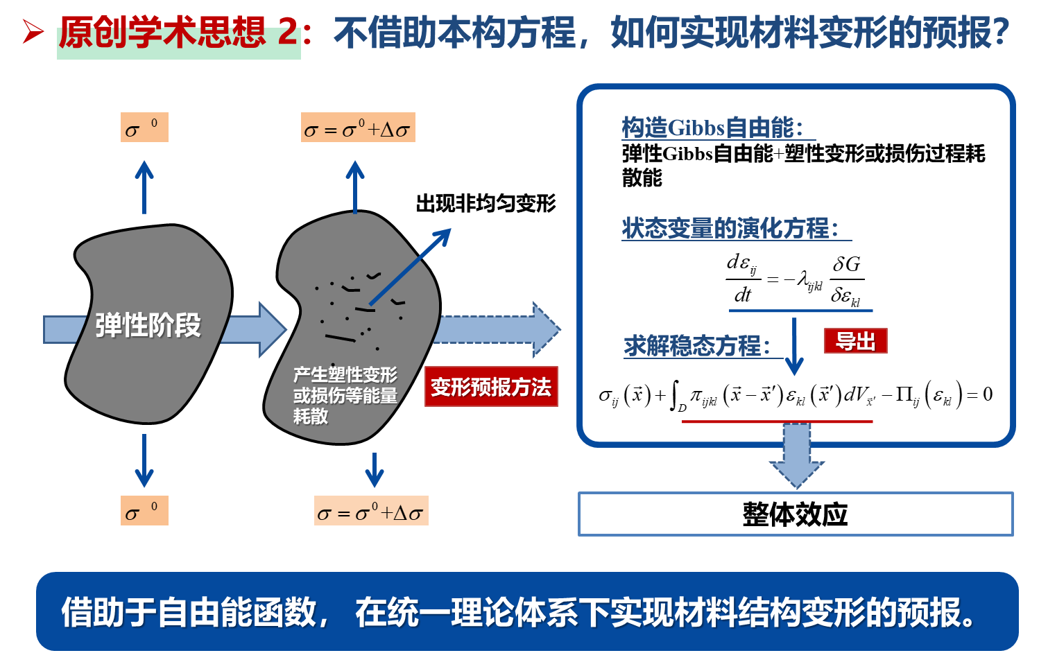 长期以来,作为固体力学的核心问题之一,如何准确地预报材料结构强度和变形的问题一直未能得到圆满的解决,导致工程结构安全可靠性一直面临重大的挑战。中心团队拟将外载作用下的材料结构等效为非平衡态演化系统,结合材料结构的失效机理,建立其热力学演化方程,从而得到稳态方程和临界平衡条件,最终实现变形预报以及导出材料结构不同失效模式的破坏准则。该理论体系摒弃基于经验的强度准则以及材料的局域本构方程,可实现对材料结构强度和变形局域化的准确预报,极具原创性。该项目有望为工程材料结构精细化设计提供可靠的理论依据和设计基础,最大限度发挥材料的潜能,将给社会带来不可估量的社会和经济效益。