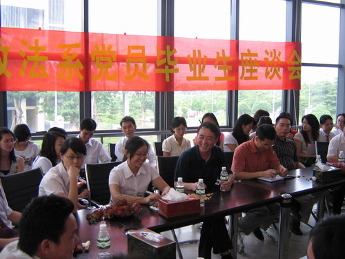 07届毕业生离校在即,政法系党总支高度关注毕业生的思想动态,6月28日下午,政法系党总支在党员活动室召开毕业生党员教育会议。政法系党总支书记李洪君在会上强调要充分发挥党员骨干的先锋表率作用,通过加强毕业生党员的教育,以党员服务普通同学,以党员影响其他同学,切实解决毕业生们面临的各种问题,稳定毕业生的情绪,顺利地做好毕业生离校工作。毕业生党员们表示会不辜负党组织的期望,发挥先锋骨干作用,为理工学院,为社会贡献力量。