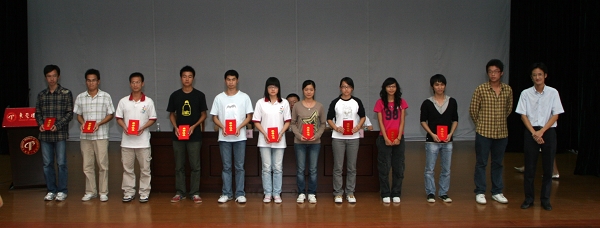 一批在暑期社会实践中表现突出的先进个人、集体在大会上受到表彰。其中,工商管理系、中国语言文学系等两个系获优秀组织奖单位,何先义、刘永安、严前海、谢炯标、李春红等五位获优秀指导老师,东莞市横沥镇实践分队等13个优秀实践团队,《民办教育在东莞的发展》等10篇优秀调研报告,李晓彦等456名活动积极分子,《勇闯毕业墙》等18件摄影作品给予了表彰。