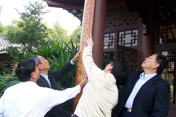 12月28日,在新的一年到来之际,原东莞市市长郑锦滔为人民公园新八景之一的“风篁煮茗”,送上了新春对联牌匾。我院党委书记周致纳、院长杨晓西以及莞城区党委书记王检养与老市长郑锦滔一起为“风篁煮茗”悬挂了对联。 郑锦滔老市长送上的对联牌匾是根据“风篁馆”有感而发而题写的,上联是“风入楼台碧绿秋波情似水”,下联是“篁龙驾雾腾空飞跃映云峰”,深刻描绘出了“风篁馆”那种碧波连天的江南意境。据悉,该对联牌匾选用了缅甸黄花梨树的木材,邀请雕刻名家花了三个多月的雕刻而成的。