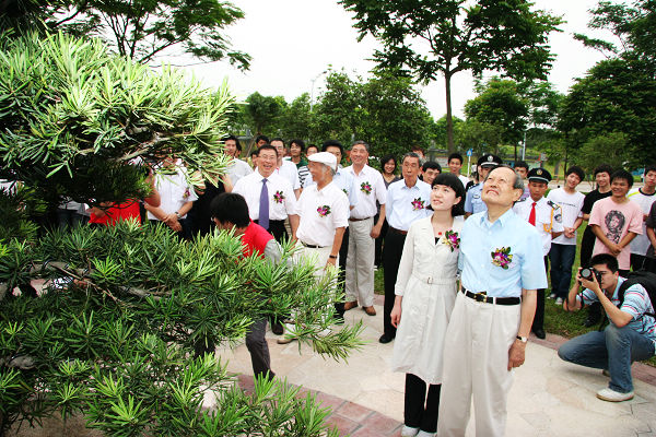 昨日下午5时许,杨振宁博士伉俪在市老领导郑锦滔,我校周致纳书记和杨晓西校长等的陪同下,来到院士林浇灌去年亲植的罗汉松。 一来到罗汉松前,周致纳书记向杨振宁讲述罗汉松的近一年来的生长状况。在微风的吹动下,罗汉松翠绿的枝叶轻轻地摆动着,仿佛欢迎主人的到来。随后,杨振宁伉俪一起浇灌了罗汉松,两人还不约而同地抬头仰望罗汉松,场面很是温馨。 在5月17日下午,杨振宁博士在学校发展情况汇报片里看到长势旺盛的罗汉松时,也忍不住低声说:“这棵树生长得很好!”