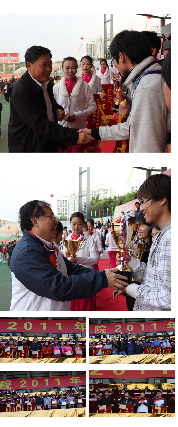 12月9日,我校2011年田径运动会圆满落下帷幕。学校领导周致纳、杨晓西、黄碧莲、吕琦元、戴炳源、李忠红等出席了闭幕式,并为获奖代表队颁奖。