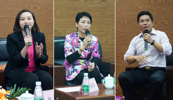 (左起)张洁锋、林玲芳、黄金和与文学院学生进行交流