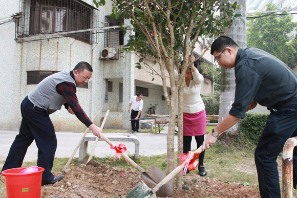 春风送爽,万物复苏。 3月12日是植树节,上午,莞城校区管委会各部门负责人和部分教职工来到教工宿舍旁的空地栽植桂花树。校党委委员、校长助理、莞城校区管委会主任邢大立和大家一起种下对春天的热切期盼。 植树现场气氛热烈,老师们干劲十足。大家分工合作,有的移拽树木,有的挥锹铲土,有的填土浇水,忙得不亦乐乎。大家通过团结协作,为校园增添了一分新绿,也身体力行响应了环保的号召。