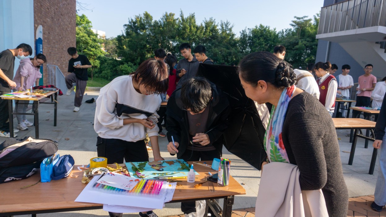 参与同学用自备的枯叶、干花以及现场提供的卡纸、胶水、剪刀等物品进行创作。同学们想象力丰富,动手能力强,利用花草落叶表达自己独特想法,制作了具有个人特色、生动且有意义的优秀作品。创作结束后,大家将作品摆放至展示区,供互相参观与交流。同学们在与同伴的互动交谈中感悟自然魅力,体悟创作乐趣。
